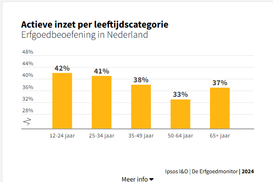 | In Nederland zet 38% van de bevolking van 12 jaar en ouder zich in hun vrije tijd actief in voor materieel en immaterieel erfgoed. Er zijn zo'n zes miljoen erfgoedbeoefenaars in ons land. Jongeren zijn het meest actief in het beoefenen en bewaren van erfgoed. Dat blijkt uit het onderzoek 'Actief met erfgoed in de vrije tijd – Monitor Erfgoedbeoefening 2025' van de Rijksdienst voor het Cultureel Erfgoed (RCE) en het Kenniscentrum Immaterieel Erfgoed Nederland (KIEN). |